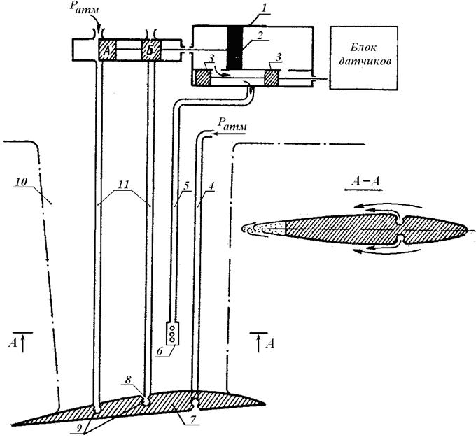 где Q — объем воздуха, расходуемый на вентиляцию, м3/с; Эксперименты и натурные данные показывают, что состояние полной аэрации или полного насыщения, когда достигается возможно максимальное снижение подъемной силы вентилированием, наступает при CQ = 0,0045. При этом суммарная площадь отверстий, подводящих воздух, должна составлять не меньше 1% от вентилируемой площади крыла. Установлено также, что наиболее выгодным с точки зрения эффективности, изменения подъемной силы является расположение ряда воздухоподводящих отверстий примерно на середине (по хорде) крыла. Однако при этом существенно возрастает сопротивление, и поэтому постоянная или режимная подача воздуха для поддержания расчетного значения подъемной силы обычно осуществляется через задний ряд отверстий, а когда после насыщения требуется дальнейшее уменьшение подъемной силы, включается и передний ряд отверстий. Принципиальная схема автоматически управляемого вентилируемого крыла показана на рис. 3.6. В пустотелых стойках 10 и крыле 7 проложены воздушные трубопроводы 9 и 11, по которым через командно-исполнительные органы САУПК атмосферный воздух подводится к вентилируемым участкам площади крыла. Из труб 9 через часто расположенные небольшие отверстия воздух выходит в канавки 8, расположенные на засасывающей поверхности крыла. Скапливаясь в канавках, воздух относительно спокойным ровным слоем обтекает аэрируемую часть поверхности крыла. В стойках проложены также воздушные трубопроводы 5, нижние концы которых соединяются с отверстиями 6 в стенках стойки. Отверстие 6 — это так называемый приемник рабочего давления сервоусилителей. Обтекающий стойку поток вследствие эжекционного (отсасывающего) эффекта через отверстие 6 создает в трубопроводе 5. пониженное давление. Верхний конец этого трубопровода соединен с золотниковой коробкой пневмосервоусилителя 1. Под воздействием механических сигналов датчиков автоматической системы управления золотники 3 перемещаются и соединяют трубопровод 5 с левой или правой полостью рабочего цилиндра пневмосервоусилителя. В результате возникающей разности давлений в полостях цилиндра (в одной полости атмосферное давление, а в другой, соединенной с трубопроводом 5, — пониженное)поршень 2 будет перемещаться влево или вправо, развивая достаточное усилие, чтобы открыть или закрыть клапаны А и Б, регулирующие подачу атмосферного воздуха к засасывающей поверхности крыла. Пневмосистема вентилирующего устройства отрегулирована так, что при расчетном положении крыла золотники сервоусилителя разобщают полости его цилиндра с трубопроводом 5. При этом клапан А приоткрыт, и воздух непрерывно поступает на поверхность крыла через задний ряд отверстий. Если из блока датчиков по