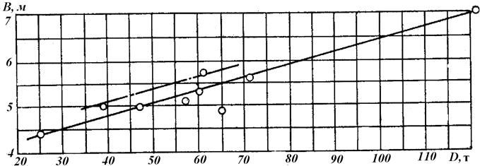 где В — расчетная ширина по ВЛ, м; D - водоизмещение, определенное в первом приближении, т. Полученное значение ширины целесообразно сразу же сопоставить с ее