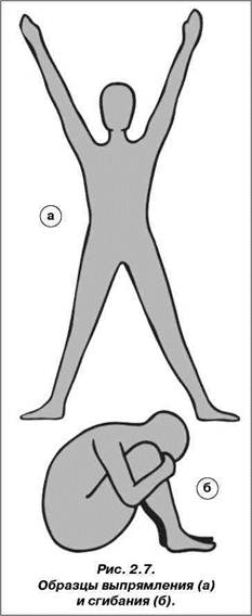 При совершении каждого целенаправленного движения в суставе никогда не работает только одна мышца, одна всегда работает концентрически, а другая, мышца-партнер, — эксцентрически. Если разгибатель работает концентрически, т.е. двигает, то сгибатель тормозит движение эксцентрически, постепенно уступая, и, таким образом, движение может быть выполнено с точностью до миллиметра. В результате сустав в случае каждого правильно выполненного движения оказывается как бы ведомым мышцами с обеих сторон, они же защищают его от перегрузки. Движение, как правило, осуществляется не в одном отдельном суставе. Оно возникает, а затем разрастается, образуя так называемые мышечные цепочки во всем теле. Вы можете легко это почувствовать, если, свесив руки вдоль тела, начнете вращать большие пальцы сначала вперед, а потом в стороны по кругу. Движение распространяется, ладони смотрят наружу, плечи отводятся назад, грудная клетка выпрямляется, а голова поднимается. Это движение называют образцом сгибания или выпрямления (рис. 2.7). Если же вы бу- дете поворачивать руки в обратном направлении, то сначала округлятся ваши плечи, потом спина, наклонится голова, — так возникает образец сгибания. Если