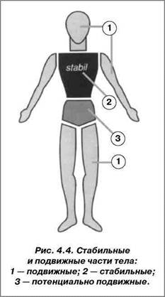 Так же, как в идеальном случае, когда таз делит тело на две равные половины, для верхней части туловища существуют индивидуальные пропорции. Ее можно рассматривать как некую башню, состоящую из трех строительных элементов — таза, грудной клетки и головы. Чтобы измерить длину отдельных частей верхней части корпуса, а также сравнить их между собой, нужно измерить таз от уровня тазобедренного сустава до пупка, грудную клетку — от пупка до ямки между ключицами и голову от подбородочной ямки до темени. Нормальное соотношение этих частей должно быть следующим: 1/5:2/5:2/5 (рис. 4.3). Деление тела человека на пять функциональных частей оказывается полезной схемой для наблюдением за движением (рис. 4.4).