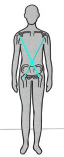 Если провести две диагональные линии от плечевых суставов к тазобедренным, то они пересекутся в так называемой индивидуальной средней точке тела (рис. 4.5). Здесь расположен центр движения, средняя позиция. Мускулатура торса, а также конечностей в основном расположена вдоль этих воображаемых диагоналей. Движения, протекающие как бы по диагонали, очень экономичны для тела. Так, например, при ходьбе диагональным маятником нам служит рука. Постарайтесь внимательно рассмотреть фотографии спортсменов, и вы увидите, что их торс всегда напрягается по диагонали. Только таким образом наш организм может работать в полную силу. В процессе верховой езды натяжение мышц по диагонали также имеет решающее значение. Это не сразу бросается в глаза, но уже при повороте внутренняя часть ваших бедер и внешняя часть плеч должны быть натянуты по отношению друг к другу по диагонали, в противном случае вы либо растянете себе бедро, либо ваши плечи будут отставать от движения в целом.