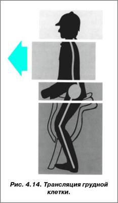 нут через пять вы снова ляжете прямо, одна сторона вашего тела покажется вам более длинной. Но к чему все эти длинные отступления? Благодаря позвоночнику верхняя часть корпуса является очень подвижной структурой, труднее всего подчинить ее своему контролю и особенно трудно обрести равновесие в движении. Итак, сядьте на табуретку и еще раз повторите движение перекатывания таза (см. главу о тазе). Если вы будете при этом внимательно наблюдать за собой, то заметите, что движение в области таза, как и движение во всем туловище, протекает подобно цепной реакции. Собственно, все это сводится к очень простому показателю: если положение таза правильное, то и положение туловища находится в норме. К сожалению, справедливо и обратное: без правильного положения таза невозможно правильное положение туловища. Поэтому таз, как нижний строительный элемент, должен всегда находиться в правильном положении (рис. 4.13). Как же можно проверить, что остальные строительные элементы правильно расположены над тазом? Нащупайте одной рукой самый нижний край грудины, а другую положите на верхний край лобковой кости. Если вы станете делать перекатывающиеся движения через таз, то заметите, что расстояние между вашими руками то сокращается, то увеличивается. При увеличении грудная клетка автоматически выпрямляется, а мышцы живота при этом удлиняются — еще один пример того, что мускулатура работает на удлинение, а не на сокращение! Но такие упражнения, как «складной ножик» и «откидное сидение» вы уже вычеркнули из своей гимнастической программы, прочитав главу о физиологии... Во время движения таза в поясничной области позвоночника осуществляются движения сгибания и распрямления, которые выше мы обозначили как основное направление движения в поясничной области позвоночника. Критической точкой является место перехода к грудному отделу позвоночника, которое осуществляет скорее вращательные движения, нежели сгибание и разгибание. Нередко приходится слышать, что в поясничной части позвоночника осуществляется рычаговое движение, т.е. вместо выпрямления в грудном отделе позвоночника внизу в поясничном отделе происходит как бы опрокидывающее движение, и вся грудная клетка перемещается назад — это часто встречающаяся неверная интерпретация выпрямления. Чтобы проконтролировать себя в этом случае, снова нащупайте нижний край грудины, а другой рукой нащупайте сначала подбородочную ямку, а затем верхний край грудины. Теперь еще раз подвигайте тазом. При этом вы заметите, что вперед выдвигается то одна, то другая рука. Ваша грудная клетка находится в прямом положении, когда обе руки по отношению друг к другу находятся на одной горизонтали. Сравните с фотографиями, приведенными в разделе 4.6. Другая не совсем простая возможность движения туловища — это смещение, которое принято называть трансляцией (рис. 4.14). При этом один строительный элемент смещается вперед или в сторону, хотя в отдельных позвонках не происходят наклон вперед, выпрямление или наклон в сторону. Положите руки, как вы это только что делали, на оба конца грудины и попробуй-
