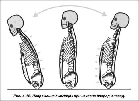 те сместить грудную клетку вперед, назад или в сторону. Руки при этом должны все время оставаться строго одна под другой. В первую очередь обратите внимание на смещение вперед. Оно играет существенную роль для включения в движение лошади. Я помню, как один тренер советовал своей ученице: «Постарайся как бы вытянуть свою грудину, у тебя, конечно, ничего не получится, но попробуй...», — и после того, как маленькая всадница сместила грудную клетку вперед: «Вот видишь, все-таки получилось!». Такое представление, что грудину можно растянуть в длину подобно резиновой ленте, очень помогает для выпрямления в области грудной клетки (нет угрозы рычага выше поясничного отдела позвоночника). Другой фактор, который не стоит недооценивать при движении туловища, это дыхание. В прямом положении у диафрагмы гораздо больше места и дыхание может осуществляется беспрепятственно вплоть до таза. Я неоднократно обращала ваше внимание на то, насколько это важно для общего взаимодействия мышц. При прямой посадке все строительные элементы верхней части корпуса расположены один над другим таким образом, как если бы они и сами по себе были устойчивы, стабильны. Здесь нужна лишь минимальная поддержка со стороны мускулатуры. Положите одну руку на спину, а другую на живот. Вы почувствуете, как при наклоне вперед обе мышцы— выпрямителя туловища напрягаются, и туловище должно удерживать собственный вес (рис.4.15). При наклоне назад они снова расслабляются, но теперь вы ощущаете рукой, что напряглись мышцы живота. Ваше индивидуальное среднее положение туловища такое, когда одна группа мышц еще не начала работать, а другая уже закончила свою работу. Таким образом, туловище находится в очень лабильном состоянии равновесия. Я уже упоминала о том, что именно из состояния подвижного равновесия движения возникают быстро и легко. Голова всадника играет важную роль в сохранении общего равновесия. Как правило (это зависит от ее содержания), она весит достаточно много, и ее вес су-