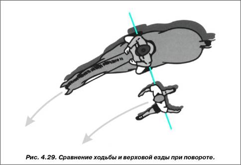 Рис. 4.28. Сбалансированное положение корпуса на облегченной рыси. можность улучшить тонкий баланс, необходимый на выездковой посадке. Логическая взаимосвязь между всеми видами посадки — это хороший стимул для многосторонней подготовки. Вы сможете улучшить ваше равновесие на выезд-ковой посадке, если будете часто менять ее на облегченную. При этом лошадь оказывается хорошим учителем. Как только вы перестанете сопровож- дать ее движения корпусом и потеряете равновесие, равновесие лошади также будет нарушено, и она отреагирует на это соответствующим образом. Итак, на строевой рыси больше наклоняйте свой корпус вперед и отклоняйтесь назад таким образом, чтобы лошадь продолжала двигаться свободно. Тогда вы почувствуете, что значить полностью слиться с ее движениями. Смена строевой рыси на учебную (а также на рысь без стремян) учит сохранять равновесие и тренирует чувство движения верхней части корпуса. При поворотах и на галопе можно хорошо почувствовать боковое распределение веса. Почувствуйте, как каждое перемещение в сторону связано с основным движением вперед, что уже было описано выше. Мысленно сравните это с ходьбой (рис. 4.29). Когда вы бежите по кривой, попробуйте приостановиться и посмотреть, какое бедро выдвигается вперед первым и что происходит с противоположным плечом. Вы увидите, что при езде верхом требуется именно это. Такое диагональное напряжение, называемое также вращательной посадкой, не представляет собой какого-то очень сложного элемента, это совершенно обычное для нас двигательное поведение, нам только нужно научиться переносить его на лошадь. Находящаяся в равновесии верхняя часть корпуса придает стабильность каждому воздействию всадника на лошадь (рис. 4.28). Если же равновесие отсутствует, то его можно обрести, прилагая определенные усилия и направленно воздействуя на свой корпус. При этом особенной нагрузке подвергаются суставы, прежде всего позвоночника, да и равновесие лошади тоже часто бывает нарушено. Чем больше вы будете работать над равновесием верхней части корпуса, тем больше узнаете о своих маленьких недостатках и лучших сторонах; вы будете ездить верхом красиво, прилагая минимум усилий и щадя спину лошади, — поверьте, она будет вам очень благодарна за это.