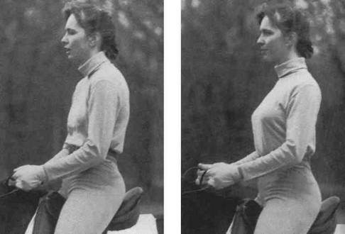 Рис. 5.12. Положение рук при прыжке в случае мостка из поводьев примите непринужденную позу, округлив при этом спину, начиная от таза. В таком положении ваши плечи, а часто и голо-ваобращены вперед, при этом шейный отдел позвоночника сильно прогибается. Как же можно исправить положение? «Отвести плечи назад!» — в этом контексте эта команда имела бы фатальные последствия. Если, не меняя положения туловища, вы просто отведете лопатки назад, сведя их вместе, это будет весьма трудоемкий и неестественный способ поправить положение, долго вы так не выдержите. Поэтому опустите плечи снова вперед и вниз и начните выпрямляться от уровня таза. При этом грудная клетка автоматически выпрямляется, как будто вы подсовываете ее под плечевой пояс. В результате этого движения строительные элементы корпуса снова оказываются в положении друг над дру- гом, и плечевой пояс держится сам по себе, т.е. без мышечной активности. В любом другом положении плечевой пояс удерживается только благодаря работе мышц. Итак, важно усвоить, что вы должны как бы подсунуть грудную клетку под плечевой пояс, сохраняя при этом ее максимально расслабленное положение, а не отводить плечи назад. Это касается и правильной выездковой посадки. На облегченной посадке корпус всадника наклонен вперед и, если не использовать при этом работу мышц, то плечи будут еще больше свешены вниз (рис. 5.13 и 5.14). В главе о верхней части корпуса я уже объяснила, насколько важно при наклоне вперед не менять положение позвоночника. Здесь большую роль играет тонус мышц корпуса всадни-