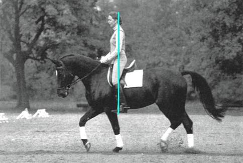 Рис. 7.3. Правильная строевая рысь с линией нагрузки. держаться более вертикально). На строевой рыси особенно важна длина бедер. Длинное бедро требует большего наклона вперед, чем относительно короткое бедро. Только после того, как верхняя часть корпуса всадника будет сохранять равновесие над изменяющейся площадью опоры, руки смогут обрести независимый от привставания и опускания в седло равномерный контакт со ртом лошади. Понаблюдайте за разными всадниками, когда они едут строевой рысью. Довольно распространенной является такая привычка — привставая и опускаясь в седло, соответственно поднимать или опускать руки. В этом случае можно хорошо поупражняться, придерживаясь за ремешок впереди седла. На строевой рыси он не должен колебаться ни вперед-назад, ни вверх-вниз, надо суметь добиться его равномерного натяжения на каждой фазе строевой рыси в любом из желаемых направлений (например, вперед и вверх). Ноги всадника на строевой рыси не должны судорожно сжимать бока лошади и быть выпрямленными в стороны. Как привычка вставать на стременах, так и попытки, слишком выпрямляя колени, привставать в седле как можно выше, слишком сильно выпрямляя колени, препятствуют тонкой игре балансирования над разными площадями опоры (рис. 7.4). Бывает действительно трудно уяснить себе, что при привставании в седле площадь опоры опускается ниже, а при опускании в седло, хотя ноги оказываются ниже, а яго-