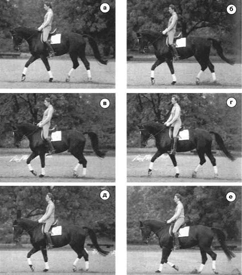 В любых теоретических основах верховой езды средства управления делятся на уклоны корпуса всадника, работу шенкелей и повода. И самое позднее — перед сдачей экзамена на квалификацию — их схематически заучивают наизусть. Всадники знают о воздействии веса, нагружающего или разгружающего один или оба бока лошади; о высылающих и сдерживающих воздействиях шенкелями, заставляющих лошадь двигаться вперед и в стороны; уступающую, набирающую, сдерживающую и выдерживающую руку. Если к этим знаниям еще прибавить и соответствующий инструктаж, то экзамен, по крайней мере теоретически, можно считать выдержанным. Конечно же, из теоретических руководств известно, что эти команды должны быть согласованы между собой, именно их четкое взаимодействие определяет чутье всадника. В этой главе я не буду схематически дифференцировать команды я хочу больше рассказать об этом чутье и показать возможности, а также способы научиться чувствовать лошадь. Научиться правильно пользоваться средствами управления совсем не так просто. Прежде всего, это чисто техническое обучение движению, например; вращение лучезапястного сустава. Но в какой момент, насколько интенсивно и как долго следует использовать это воздействие — вот что главное в обучении искусству верховой езды. Ключевую роль в управлении лошадью играют уклоны корпуса всадника. От собственного веса никуда не денешься. Ноги можно вытянуть, поводья можно бросить, но наш вес, которым мы давим на седло, остается неизменным! Его можно слегка перераспределить, но 60 кг всегда остаются 60 к г, и лошадь вынуждена их нести на себе. Здесь я хочу еще раз напомнить вам пример с рюкзаком. Он показал нам, что для того, кто несет рюкзак, решающее значение имеет не вес в килограммах, а то, как он распределяется и удерживается на спине. Так, грузный всадник может быть приятнее для лошади легкой конституции, чем легкий, но сидящий несбалансированно. Итак, от своего веса всаднику никуда не деться. Идеальная цель заключается в умении сидя на лошади настолько хорошо распределить свой вес, чтобы постоянно сопровождать ее движение корпусом, быть его частью. Как только всадник начинает опережать корпусом движение лошади или отставать от него, это немедленно и ощутимо нарушает ее равновесие и естественный темп движения. Такое же влияние оказывают и боковые перераспределения веса всадника. Лошадь должна отреагировать на новую ситуацию равновесия и делает это, либо подставляясь под этот вес сбоку, либо уклоняясь от него в противоположную сторону. Если посмотреть на все с этой точки зрения, то верховая езда — это большая игра в равновесие, поскольку лошадь реагирует даже на минимальное изменение распределения веса всадника. Со стороны эти мельчайшие перераспределения веса могут быть незаметны, но лошадь реагирует на них мгновенно, чтобы вновь найти общее равновесие вместе с всадником. Садясь на лошадь в следующий раз, попробуйте ощутить, действительно ли ваш вес постоянно перемещается, чувствуете ли вы себя постоянно в балансе. Подумайте при этом, какой длинный рычаг представляет собой ваше туловище, и тогда вы поймете, как сильно может повлиять на ваш баланс даже немного наклоненная вперед или в сторону голова. 7.2. Плавный переход с выездковой посадки на облегченную посадку и их взаимодействие Как уже упоминалось ра