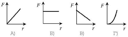 15. Какой из графиков верно отражает зависимость силы всемирного тяготения двух материальных точек от расстояния между ними?
