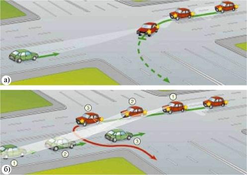 При повороте налево нередко водитель-“новичок” пытается “выждать” встречный автомобиль в движении. Вместо того чтобы остановиться у центра перекрестка и там ожидать проезда встречного транспорта (рис. 46 а), он продолжает ползти дальше, не замечая и не осознавая этого, поскольку взгляд его прикован к встречной машине (рис. 46 б). Ну а дальше следует попытка по невероятной траектории завершить поворот налево, что не всегда заканчивается благополучно.