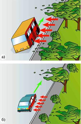 Не углубляясь в законы аэродинамики, можно догадаться, что ветру будет легче “победить” высокий автобус, чем приземистый автомобиль.