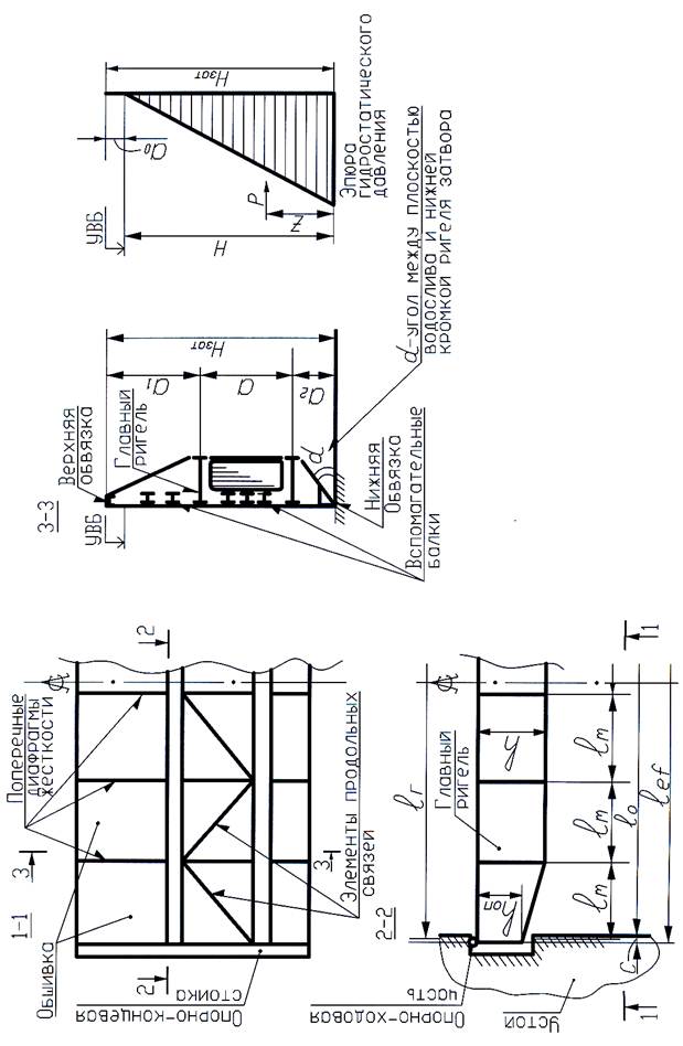 Далее проверяют угол L между плоскостью водослива и нижней кромкой ригеля затвора. Для устранения вакуума (при угле L<30º) в стенке сплошного нижнего ригеля по линии нейтральной оси необходимо устраивать отверстия для прохода воздуха в зону возможного вакуума. Суммарная площадь этих отверстий должна быть не менее 20% площади стенки ригеля. Проверку угла L можно выполнить графически, для чего предварительно принять ширину безнапорного пояса 1/4…1/5 от высоты ригеля h. Установив положение ригелей, переходят к расстановке вспомогательных балок, расстояния между которыми определяются конструктивными требованиями по обеспечению пространственной жесткости затвора и устойчивости обшивки на участках между смежными балками. При этом следует учитывать, что в затворах с шириной отверстия в свету ℓ0 >10 м толщина обшивки tоб принимается от 10 до 20 мм; что позволяет избежать получение вмятин при случайных ударах по обшивке. В первом приближении эти требования можно считать выполненными, если расстояние между центрами тяжести смежных балок (или балки и ригеля) - ℓоб не более следующих значений, выраженных в долях толщины обшивки при tоб = 10 мм: ℓ0 ≤ 70 tоб - на участках а 2 и а; ℓ0 ≤ 90 tоб - на участке а 1; ℓ0 ≤ 120 tоб - на участке между верхней обвязкой и ближайшей балкой. В дальнейшем, при расчете обшивки, достаточность принятых расстояний ℓоб уточняется. Стальная обшивка совместно с балочной клеткой образует жесткий диск, который надежно обеспечивает неизменное положение в пространстве сжатых поясов ригелей и их устойчивость в вертикальной плоскости. Геометрическая неизменяемость растянутых поясов ригелей обеспечивается введением в конструкцию затвора поперечных диафрагм и элементов фермы продольных связей (см. рис. 1). Поперечные диафрагмы из листовой стали располагают в вертикальных плоскостях перпендикулярно обшивке затвора, а продольные связи – в плоскости безнапорных поясов ригелей; при этом, в такой пространственной конструкции элементы поперечных диафрагм являются одновременно и стойками продольной связевой фермы. В курсовом проекте, в учебных целях, рекомендуется принять решетку продольной фермы с переменным направлением раскосов (см. рис.1). Нагрузки от гидростатического давления и силы веса затвора определяют по §5,2 [2].