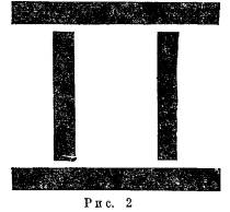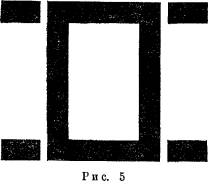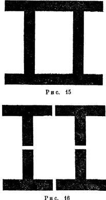 1. Два параллельных бруска, разделенных двумя короткими перекладинами, чуть отстоящими от концов брусьев. 2. Горизонтальная балка, удерживаемая на другой, такой же горизонтальной балке двумя вертикальными стойками, 3. Прямоугольник, у которого две короткие стороны слегка сдвинуты к середине. Существует также масса других способов описания приведенного здесь принципа деления фигуры. Деления производятся исключительно в уме, слушатель получает лишь описание составных частей фигуры и их соотношения, в результате чего он может представить себе всю фигуру. Это напоминает перевозку громоздкой машины, которую вынуждены разобрать на мелкие и более удобные для перевозки части и в таком виде отгрузить заказчику, приложив инструкцию по ее сборке. Представленный на рис. 2 принцип деления фигуры совершенно произволен. На рис. 3 предлагается другой способ деления той же фигуры, которая в этом варианте может быть описана следующим образом: две фигуры, имеющие форму желобов, сверху и снизу разделены двумя поперечными перекладинами. Вся фигура представляет собой единую конструкцию одинаковой ширины.