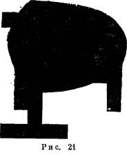 На рис. 19 также изображена довольно сложная фигура (но более простая, чем на рис. 17). Можно опять попробовать описать ее с помощью Т-образных элементов и лишний раз убедиться, что такое описание вполне осуществимо. Однако соотношение Т-образных элементов при таком описании будет по-прежнему сложным. Описание можно упростить, если фигуру разделить не на Т-образные, а на 1-образные элементы, как это показано на рис. 20. Взаимоотношение трех получившихся при этом 1-образных элементов очень простое. Разумеется, каждый из 1-образных элементов представляет собой два Т-образных элемента, соединенных по основаниям. Чем более крупные элементы деления фигуры, тем проще их соотношения. Так, на смену основным Т-элементам приходят их стандартные соединения. В некоторых случаях большие блоки выполняют функции основных элементов деления без каких бы то ни было ссылок на то, что они составлены из Т-образных элементов.
