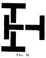 На рис. 22 показано удачное сочетание Т-образных элементов, которое полностью совпало бы с выступающими частями предыдущей фигуры. Испробовав все прочие возможные комбинации Т-образных элементов, мы убедимся, что предложенное на рис. 22 сочетание является единственно возможным для объяснения фигуры на рис. 21. По-видимому, такая комбинация является точным отображением скрытой под пятном фигуры. Если удалить пятно, то под ним откроется именно эта фигура. Последнее заключение относится к такому виду естественного предположения, которым обычно сопровождается появление гипотез. И хотя только одним сочетанием Т-образных элементов можно правильно объяснить форму замазанной пятном фигуры, однако пот никаких оснований предполагать, что эта фигура обязательно должна делиться на Т-образные элементы. В данном случае Т-образный элемент оказался полезным элементом описания, который, возможно, был единственным имеющимся в наличии знакомым элементом. Однако ни одно из этих обстоятельств но меняет его произвольного характера. Этот элемент существует только ради удобства. Форма новой фигуры не обязательно должна соответствовать чисто произвольному способу описания ситуации. Однако вера в полезность Т-образного элемента, испытанная на практике, может легко навести на мысль о необходимости такого соответствия. Вполне возможно, что другой человек, имея в наличии другую знакомую фигуру, решит, что замазанная фигура должна быть объяснена именно с помощью этой известной ему фигуры. Действительно, каждый человек формулирует единственно возможную гипотезу, используя имеющиеся знакомые фигуры (в данном случае Т-образный элемент). Тем не менее такая гипотеза, сколь бы точно она ни формулировалась на языке Т-образных элементов, всего лишь предполагает (но не доказывает), что данная фигура должна иметь именно такую форму. Единственным доказательством гипотезы является ее полезность, и, пока полезность продолжает иметь место, гипотеза остается в силе. Однако даже полезность не должна препятствовать поискам лучшей гипотезы, которая, возможно, будет использовать при описании другие знакомые фигуры. Когда мы описывали вышеприведенные фигуры, полностью доступные восприятию, мы могли использовать любой метод описания, однако, когда мы имеем дело с частично закрытыми фигурами, любая примененная в этом случае гипотеза может оказаться непригодной. Одной из главных задач мышления является необходимость постоянного уяснения разного рода незнакомых ситуаций. Как правило, имеется некоторая фигура, которую требуется уяснить с помощью сочетания уже знакомых фигур. Сочетание знакомых фигур всегда направлено к какому-то практическому результату, в котором постоянно используется все увеличивающийся набор знакомых фигур и их соотношений. Однако существует и другой метод использования знакомых фигур. Фигуры могут быть составлены совершенно произвольно, по любому образцу или же на основании законов гармонии. Подобные сочетания составляются исключительно ради самих сочетаний. Такого рода игра со знакомыми фигурами, казалось бы, абсолютно бесцельна, и тем не менее она может оказаться весьма полезной. В ходе игры могут возникнуть интересные сочетания, которые дополнят список знакомых фигур и будут в такой же степени полезными, как и те, что были полу
