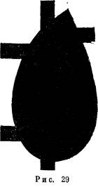 На этот раз по сравнению с предыдущим еще большая часть фигуры недоступна исследованию. Весьма сомнительно, можно ли вообще получить какие-то сведения о данной фигуре из исследования ее видимых участков. Мы имеем возможность, как и раньше, испробовать множество различных гипотетических сочетаний основного Т-образного элемента. Поскольку в нашем распоряжении имеется большое количество предполагаемых сочетаний, на первый взгляд полностью совпадающих с рисунком, мы не в состоянии сказать определенно, какое из этих сочетаний следует использовать. Поэтому мы еще и еще раз вынуждены обращаться к скрытой под пятном фигуре и внимательно ее изучать. В результате мы убеждаемся, что для фигуры, изображенной на рис, 29, сочетание Т-образных элементов, по-видимому, неприменимо.