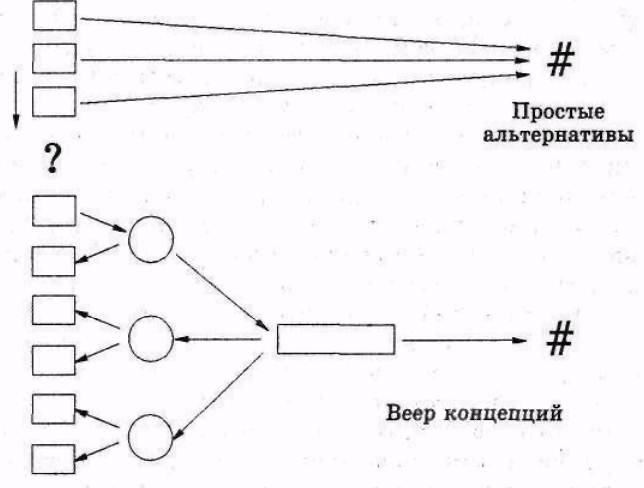 Путешественник ориентируется на поиск деревни Н. Затем сельский житель продолжает объяснять: «Деревню тоже легко найти. Доедете до города Л, а там указатели на каждом повороте». Таким образом, получив инструкцию, путешественник должен прочесть ее задом наперед: сперва найти город, затем деревню и лишь потом — хутор. То же самое происходит и при создании веера концепций. Мы начинаем с цели и затем переходим к практическим способам ее достижения. Различие между веером концепций и простым списком альтернатив показано на рисунке 2.7. Веер расширяется от уровня к уровню как лавина.