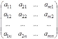Означення. Матрицею називається прямокутна таблиця, яка складається з елементів даного поля. Загальний вигляд матриці: A = де аij,аi,bj - елементи матриці. Якщо в матриці А кількість рядків дорівнює кількості стовпців, тобто m=n, то вона називається квадратною матрицею n-го порядку; якщо ж m¹n, то матриця називається прямокутною матрицею розміру m*n. Головною діагоналлю квадратної матриці n-го порядку називається діагональ, яка йде від лівого верхнього кута до нижнього правого, тобто яка складається з елементів а11,а22,…,аnn. Означення. Квадратна матриця D=(dij) n-го порядку називається діагональною, якщо всі її елементи, які не належать головній діагоналі, дорівнюють нулю: "i, j (i¹ j => dij=0). Елемент головної дігоналі матриці називають i-им дігональним елементом. Діагональна матриця називається скалярною, якщо елементи її головної діагоналі рівні між собою. Діагональна матриця: D = Скалярна матриця: K = Частинним випадком скалярної матриці є одинична E і нульова O: E = Дві матриці називаються рівними, якщо рівні відповідні їх елементи. Від матриці А можна перейти до матриці А¢: A¢ = в якій рядки є стовпцями, а стовпці – рядками матриці А. Перехід від матриці А до матриці A¢ називається транспонуванням матриці А, а матриця А¢ називається транспонованою для матриці А. Якщо матриця Якщо А – довільна квадратна матриця і A¢=A, то А називається симетричною; якщо A¢=-А, то А - кососиметрична. Квадратна матриця ортогональна, якщо АА¢=A¢A=E. Матриця називається ідемпотентною, якщо А2=А.