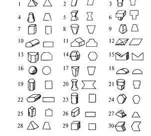 Рис. 4.15. Набор фигур, использованных в тесте на оперирование эмпирической размерностью фигур (по Дашевскому, 1972) Фигуры различались по форме и цвету. 1 — желтые, 2 — бледно-желтые, 3 — темно-серые, 4 — зеленые, 5 — неокрашенные, 6 — голубые, 7 — синие, 8 — темно-зеленые, 9 — желтые, 10— голубые, 11 — серебристые, 12 — зеленые, 13— серые, 14 — бордовые, 15 — сине-зеленые, 16 — красные, 17 — оранжевые, 18 — светло-серые, 19 — черные, 20 — серо-голубые, 21 — малиновые, 22 — темно-розовые, 23 — белые, 24 — малиновые, 25 — золотые, 26 — фиолетовые, 27 — неокрашенные, 28 — светло-розовые, 29 — неокрашенные, 30 — черные В Несмотря на принципиальные различия в строении мозга мле- Вкопитающих и птиц (отсутствие у птиц новой коры), наиболее высокоразвитые представители обоих классов достигают сходных, В достаточно высоких уровней развития элементарного мышления. Контрольный опыт. Схема задачи на оперирование размерностью позволила на ее основе разработать принципиально важный контрольный эксперимент — альтернативу логической задачи При этом все «внешние атрибуты» опыта сохраняются, за исключением собственно логической структуры теста. Задачу, предлагаемую в подобном контрольном эксперименте, нельзя решить при первом предъявлении за счет «понимания» ее смысла. То, какой выбор является правильным, можно установить только по ходу последовательных предъявлении теста (Дашевский, 1979). Поясним это на примере, приведенном на рис. 4 17 Слева вверху (А) (как и на рис. 4 14) дана схема исходного теста на ОЭРФ. В контроль-