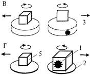Рис. 4.17. Схемы опыта по оперированию эмпирической размерностью фигур (А), контрольных опытов по выработке дифференцировочного УР на предъявление ОФ и ПФ (Б, В) и по дифференцированию двух объемных фигур разного размера (Г) (см. текст; по Дашевскому, 1979). ном опыте (Б, В) демонстрационные платформы (2), на которых в собственно эксперименте на ОЭРФ животному показывали приманку (1), а затем устанавливали фигуры (4 и 5), заменены кормушками такого же диаметра (3). Подкрепление можно помещать в любую из кормушек, и ее можно накрыть крышкой с прикрепленной к ней ОФ (как на рис. 4.17Б) или ПФ (как на рис. 4Л7В). В данной модификации контрольная задача теряет однозначность решения, поскольку приманка может с равной вероятностью находиться как в одной, так и в другой кормушке (тогда как в задаче на ОЭРФ она могла быть спрятана только в ОФ). В этом варианте задачи использовали те же самые зрительные раздражители: тот же набор ОФ и ПФ, что и в задаче на ОЭРФ (рис. 4,15). У одной группы особей каждого вида (собаки, кошки, врановые) подкрепляли выбор ОФ, у другой — ПФ. В обоих случаях при первых предъявлениях животные обеих групп выбирали фигуры чисто случайно, и лишь постепенно, после десятков сочетаний они начинали чаще выбирать подкрепляемую фигуру, т.е. вырабатывали дифференцированный УР. Следует отметить, что, как и в задаче на ОЭРФ, каждый раз животному предъявляли новую пару фигур, которая отличалась от предыдущих по всем второстепенным признакам, кроме одного: одна фигура была плоской, а другая объемной. Тем самым процедура соответствовала выработке дифференцировочного УР на обобщенный признак «размерность» (см. 3.3 и 5.5). Как показывает рис. 4.16Б, динамика обучения дифференцировке существенно отличается от динамики решения задачи на ОЭРФ. Она сравнима с той, которая характерна для животных, плохо решающих тест на ОЭРФ (например, собак) и не имеет ничего общего с динамикой реакций у животных, хорошо справляющихся с задачей (обезьяны, дельфины, врановые птицы). р Таким путем были впервые продемонстрированы четкие различия в поведении животных при решении элементарных логических задач и при выработке дифференцировочного УР, т.е. задачи, где логическая структура отсутствует (Дашевский, Детлаф, 1974; Дашевский, 1979; Крушинский и др., 1981). Животные, способные к решению задачи на «размерность», уже в первых предъявлениях теста реагируют правильно. При такой же по внешним признакам задаче, но требующей выработки дифференцировочного УР, правильные ответы появляются после десятков предъявлении. Задача на поиск приманки в двух объемных фигурах разного объема. Успешное решение теста на ОЭРФ позволило предположить, что врановым могут быть доступны и другие задачи, основанные на оперировании представлением о геометрических свойствах предметов. Для проверки этого предположения может служить тест, в котором используются две ОФ, одинаковые по форме и цвету, но существенно различающиеся по объему. За счет этого, хотя обе они обладают свойством «вмещаемости», лишь одна из них может вместить данную приманку, поскольку ее объем превышает объем кормушки в 2—4 раза, а объем второй фигуры сопоставим с ней (рис. 4.17Г). Для решения этого теста необходимо не только качественно оценить фигуры по признаку их размерности, но произвести и количественное сопоставление их параметров. В этой 