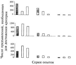 Рис. 5.2. Формирование у вороны обобщенного правила выбора по признаку «сходство». Стимулами были карточки разного цвета (белые столбики), множества с разным числом элементов (заштрихованные столбики) и арабские цифры (черные столбики). В каждой следующей серии достижение критерия требовало меньше предъявлении. 1. Перенос на новые стимулы той же категории. Это первый способ оценки уровня обобщения. В примере, который мы рассматривали в предыдущем разделе, обобщение должно было происходить по конкретному признаку — кубической форме предмета (против шарообразной). В процессе обучения число сочетаний, необходимое для появления адекватной реакции на каждую новую пару стимулов, постепенно снижалось. Число сочетаний, необходимое для достижения выбранного критерия правильных выборов новых стимулов после теста на перенос, может быть показателем достигнутого животным уровня обобщения. Чем меньше эта величина, тем ближе животное к формированию обобщения поданному признаку (рис. 5.2). Число тестов на перенос, число серий обучения с новыми стимулами, а также число предъявлении, необходимых для достижения критерия в каждой последовательной серии, — все эти показатели могут служить количественной характеристикой динамики процесса формирования обобщения. Такие сопоставления можно проводить у данного животного на разных стадиях усвоения общего правила выбора или у животных определенного вида в сопоставлении с другими видами. Результаты такого сопоставления показаны на рис. 5.2. в Если «правильный» ответ на каждую новую комбинацию сти-j мулов достигается все быстрее, то это означает, что у животного с происходит успешное обобщение данного признака. 2. Перенос на новые стимулы других категорий. Этим методом исследуют способность животных к более высокому уровню обобщения, т.е. к пониманию того, что признак может относиться к более «общей» категории. Поясним это на конкретных примерах обобщения птицами относительных признаков, таких как «сходство», «больше» и т.п. Для изучения способности птиц к обобщению по признаку «сходство» их сначала обучали выбору по образцу стимулов (предметов) разного цвета, а в тесте на перенос использовали карточки, поверхность которых была покрыта разным типом штриховки (Wilson et al., 1985, a, b). Оказалось, что в этом случае галки справились с тестом на перенос при первых же предъявлениях новых стимулов. Это означает, что у них произошло успешное обобщение признака «сходство», они смогли сформировать единое правило выбора, общее для разных категорий признаков. Они абстрагировались от конкретных особенностей стимулов. Большинство видов животных не справляется с переносом правила выбора по сходству с образцом от исходных стимулов на стимулы другой категории. Такой уровень обобщения оказывается для них слишком сложным. Так, в упомянутой выше работе Уилсона голуби, обученные выбирать стимулы по сходству цвета, не смогли правильно устанавливать сходство по типу штриховки, и решению этой задачи они обучались почти заново. Даже врановые птицы, у которых в целом такие способности развиты достаточно высоко, осуществляют перенос на стимулы другой категории не во всех случаях. Так, в опытах Смирновой и др. (1998) вороны успешно усвоили правило выбора стимулов по сходству цвета. Однако для достижения более высокого уровня 