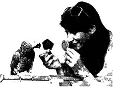 Рис. 6.5. Опыты И. Пепперберг по символизации с попугаем Алексом (фото Д. Линдена с любезного разрешения проф. И. Пепперберг, Аризонский университет, США). Обучение попугая. Несомненный интерес представляют исследования на попугаях. Известно, что представители разных видов могут выучивать и произносить сотни слов варьировать слова в предложениях, составлять фразы адекватно ситуации и вступать в довольно осмысленные диалоги со своими воспитателями. Подробное описание поведения «говорящих» птиц приводится в работе В. Д. Ильичева и О. Л. Силаевой (1990). Несмотря на важность получения сравнительной характеристики когнитивных способностей этих высокоорганизованных птиц с крупным и тонко дифференцированным мозгом, экспериментального изучения практически не проводится. Исключение составляют только многолетние фундаментальные работы американской исследовательницы Ирэн Пепперберг (Pepperberg, 1981; 1987; 2000). Она разработала оригинальный метод общения с попугаем Алексом (африканским серым жако, Psittacus erithacus), причем в качестве языка-посредника использовалась собственно человеческая речь (рис.6.5). Алекс попал в лабораторию Аризонского университета в возрасте 11 лет, т.е. достаточно взрослым, и сразу же проявил большие способности к обучению. В его присутствии люди беседовали между собой, а попугай ревностно за этим следил и старался вмешиваться в диалог. Разработанный Пепперберг метод отличается тем, что в процессе обучения участвуют одновременно два обучающих человека. Один тренер (основной) обращается одновременно и к человеку (второму тренеру), и к попугаю. Второй тренер является для попугая, с одной стороны, объектом для подражания, а с другой — как бы его соперником. Уроки проходили следующим образом. Один экспериментатор показывал другому яблоко или карандаш, спрашивая: «Что это такое?» Если ответ был правильным (причем человек старался тщательно проговаривать слова), обучающего хвалили и давали названный предмет. Приведем протокол такого опыта: Обучающий: Брюс, что это? (показывает ему тюбик с зубной пастой). Брюс (громко): Паста. Обучающий: Молодец! Возьми пасту (дает ему тюбик). Алекс (перебивает): аа Обучающий: Алекс, ты это хочешь? Что это? Алекс: Папа. Обучающий: Нет, (обращается к помощи Ирэн) что это? Ирэн: Па..а. Обучающий: Нет, Ирэн, что это? Ирэн: Па..а. Обучающий: Лучше. Ирэн: Па-ста (подчеркивая звуки «с» и «т»). Обучающий: теперь правильно, скажи еще раз. Ирэн (повторяет и получает тюбик, после чего снова произносит слово «паста», держа в руке тюбик). Алекс (сидя на клетке, тянется за тюбиком): Па! Ирэн: Лучше! Что это? Алекс: Па-а. Ирэн: Еще лучше, Алекс! Алекс: Па-та. Ирэн: Ну ладно, ты хорошо постарался, бери пасту. Алекс играет с тюбиком. За 15 лет обучения Алекс освоил около 100 наименований предметов (дерево, кожа, бумага, пробка, орех, банан, куртка, морковь, вишня, ливень, спина и т.д.). Он способен обозначить форму предмета, количество углов, считает до 6, знает названия категорий «форма», «материал», «цвет» и называет 7 цветов. Он активно пользуется словом «хочу», а если ему дают не тот предмет, который он просит, он говорит «нет» и отбрасывает его в сторону. Кроме того, Алекс усвоил обобщение по сходству и соответствию и уверенно сообщал, одинаковые ему показали предметы или разные. В ответ на предъявление различных множеств (от 2 до 6; в том числе соверше