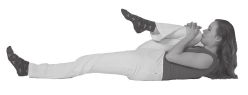 1. Лёжа на спине, поднимите вверх и вытяните одну ногу, согните её в колене, на вдохе обхватите руками и прижмите к груди, подтяните к колену подбородок. На выдохе вытяните ногу вверх и опустите.