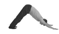 5. «Гора». На выдохе, сохраняя положение ладоней на полу, поставьте: женщины правую стопу рядом с левой, мужчины левую стопу рядом с правой. Отталкиваясь руками от пола, поднимите таз. Стопы полностью поставьте на пол.