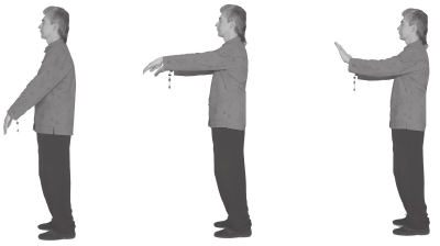 9. Опустите руки вдоль бёдер. Вдох – руки поднимите влево под углом 45° к горизонту, одновременно скручивая тело. Выдох – руки опустите в исходное положение. Вдох – руки поднимите вправо под углом 45° к горизонту, одновременно скручивая тело.