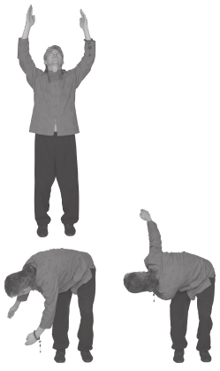 11. Руки вытяните вверх ладонями друг к другу. Вдох – наклоните туловище вперёд и влево, одновременно вынося прямые руки влево назад и поворачивая голову влево назад. Выдох – возвратитесь в исходное положение. Вдох – проделайте то же вправо. Выдох – возвратитесь в исходное положение.