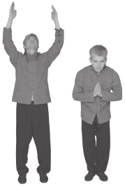 12. Вытяните руки вертикально вверх, ладонями друг к другу. Соедините ладони и опустите до уровня груди. Поклонитесь Солнцу.