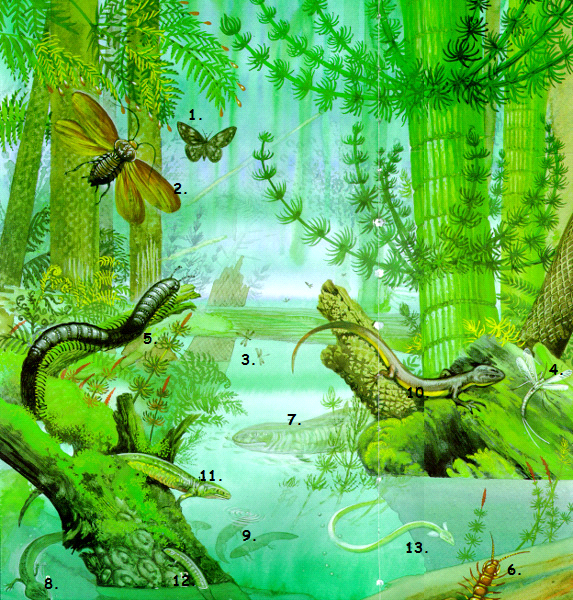 Великие каменноугольные леса. Среди пышной растительности лесов карбона преобладали громадные древовидные папоротники высотой до 45м, с листьями длиннее метра. Кроме них там росли гигантские хвощи, плауны и недавно возникшие семеноносные растения. У деревьев была крайне неглубокая корневая система, зачастую ветвившаяся над поверхностью почвы и росли они очень близко друг к другу. Вероятно, всё вокруг было завалено стволами упавших деревьев и кучами мертвых веток и листьев. В этих непроходимых джунглях растения разрастались настолько быстро, что так называемые аммонификаторы (бактерии и грибы) просто не поспевали вызывать гниение органических останков в лесной почве. В таком лесу было очень тепло и влажно, а воздух постоянно насыщен водяными парами. Множество заводей и болот представляло собой идеальные нерестилища для бесчисленных насекомых и ранних земноводных. Воздух был наполнен жужжанием и стрекотом насекомых — тараканов, кузнечиков и гигантских стрекоз с размахом крыльев почти в метр, а подлесок кишел чешуйницами, термитами и жуками. Уже появились первые пауки, по лесной подстилке сновали многочисленные многоножки и скорпионы.