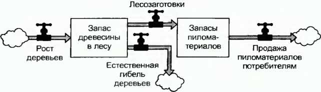 Количество древесинв 1 в лесу — это тоже запас. Входной поток — это рост дереввев. Вв 1 ходные потоки — гибелв деревьев в резулвтате естественных причин и рубок, которые производят лесозаготовители. Срубленные дереввя становятся другим запасом, например, стройматериалами на лесопилке. В свою очередв, из него исходит поток пиломатериалов, проданнв!х потребителям.