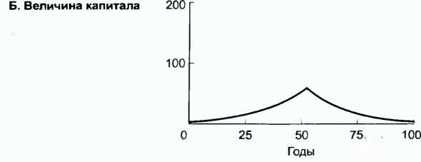Рис. 38. Добыча ресурса (А) позволяет получить прибыль, которая вкладывается в рост капитала (Б), однако параллельно с этим происходит истощение невозобновимого ресурса (В). Чем больше величина капитала, тем быстрее истощается ресурс