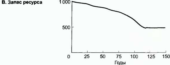 Рис. 43. Годовой улов (А) позволяет получить прибыль, которая, в свою очередь, позволяет увеличить производственный капитал (Б). После незначительного выхода за предел объемы вылова стабилизируются на определенном значении. Постоянный объем вылова приводит к тому, что запасы ресурса (В) также стабилизируются на определенном значении