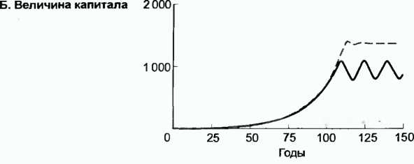 вершенствование, которое, казалось бы, должно привести рыболовецкую отрасль к процветанию, на самом деле ведет систему к нестабильности. Возникают колебания. Если технологии будут совершенствоваться и дальше, то суда смогут вести лов с приемлемой рентабельностью даже при очень низкой плотности рыбной популяции. Результатом может стать практически полное истощение рыбного ресурса (рис. 45) и, вслед за этим, распад самой рыболовецкой отрасли. Последствия этого для морских экосистем подобны процессам опустынивания на суше. Руководствуясь исключительно практическими соображениями, рыбный ресурс из возобновимого превратили в невозобновимый! В некоторых регионах планеты так и произошло. Во многих экономических системах, основанных на реально существующих возобновимых ресурсах, — в отличие от нашей сильно упрощенной теоретической модели — даже очень небольшая оставшаяся популяция потенциально может разрастись и восстановить свою прежнюю численность при условии, что производственный капитал исчез и ловля прекратилась. Тогда тот же самый тип поведения может повториться спустя десятилетия. Подобные очень продолжительные циклы восстановления после практически полного истощения ресурса наблюдались, например, в деревообрабатывающей промышленности Новой Англии (США) — в настоящее время идет уже третий цикл, состоящий из последовательных этапов роста, чрезмерной вырубки, упадка отрасли и последующего продолжительного периода восстановления. Но так может происходить далеко не со всеми популяциями. Чем совершеннее технологии добычи, чем выше их эффективность, тем больше риск того, что ресурс будет исчерпан полностью, без возможности последующего восстановления[17].