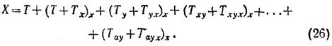 где α — некоторая последовательность индексов х и у. В каждом «кадре», на которые разбита сумма (25), элемент, принадлежащий X, отражается в элементе, принадлежащем игроку Y. Игрок имеет такую модель противника, что любая мысль X (с его точки зрения) имитируется противником X, который, исходя из результата имитации, и принимает решение. Такая модель, естественно, отдает предпочтение «наименее пагубной мысли». Игрок X будет руководствоваться той стратегией, заведомо зная которую и приняв наилучшее решение, игрок У нанесет X наименьший ущерб. А это и есть принцип максимина. Таким образом, выражение (25) представляет собой исходную логическую форму, порождающую один из основных принципов теории игр. Другая схема рассуждения, основанная на представлении о доминировании над противником, приводит к другим сетованиям для принятия решения. Пусть игрок X изображается суммой