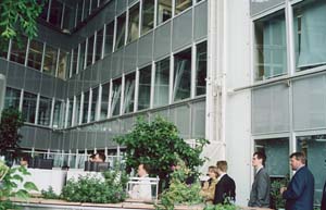 Норман Фостер рассматривал растения как нечто большее, чем просто декорацию. Эти великолепные сады являются фундаментальным элементом в его концепции. Девять зимних садов по спирали окаймляют все здание: три расположены с восточной стороны, три – с южной и еще три – с западной стороны. В ботаническом аспекте растения отражают географическую направленность: - с восточной стороны – азиатская растительность; - с южной стороны – средиземноморская растительность; - с западной стороны – североамериканская растительность. Открытые пространства садов высотой в четыре этажа обеспечивают внутренние офисные помещения достаточным количеством дневного света. Кроме этого, данные сады могут быть использованы сотрудниками для общения и отдыха – они создают ощущение пространства, а также являются частью сложной системы естественной вентиляции (рис. 2). Лифты, лестничные марши и служебные помещения расположены в трех углах. Такое расположение позволяет сгруппировать офисы и зимние сады. Решетчатые балки, прикрепленные к колоннам, размещенным в трех углах здания, несут на себе каждый этаж и зимний сад. Такое решение позволило отказаться от колонн внутри здания и обеспечило конструкции дополнительную жесткость.