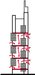 При проектировании высотных зданий также возникает проблема выбора материала конструкций здания. В США в качестве основного конструкционного материала обычно используется сталь, а в Европе – железобетон. По мнению академика В. И. Травуша, заместителя директора ЦНИИЭП им. Мезинцева, железобетонные конструкции по сравнению со стальными обладают тремя важными преимуществами: большей устойчивостью, обусловленной их большим весом; в железобетонных конструкциях быстрее затухают колебания; железобетонные конструкции более огнестойки. Именно высокие требования к огнестойкости ограничивают в Европе строительство высотных зданий с металлическими конструкциями, поскольку в случае их использования необходимо проводить дополнительные противопожарные мероприятия. После строительства высотных зданий изменяется аэродинамика городской застройки и возникают сильные воздушные вихревые потоки, поэтому при проектировании высотных зданий требуются исследования их аэродинамики с учетом прилегающей городской застройки. Большое значение приобретают требования к сопротивлению воздухопроницанию конструкций, связанные с разностью давлений воздуха на наружной и внутренней поверхностях ограждений, существенно возрастающей с увеличением высоты. Традиционные окна не обеспечивают требуемое сопротивление воздухопроницанию, поэтому для высотных зданий необходимы специальные конструкции световых проемов. Внутри высотных зданий также могут возникать сильные воздушные потоки (эффект аэродинамической трубы). Для их уменьшения должны применяться специальные решения – шлюзование входов в здание, шлюзование лестничных секций, высокая герметизация межэтажных перекрытий, герметизация мусоропроводов. Большую проблему представляет обеспечение безопасности, достаточно вспомнить недавние события в Нью-Йорке. Сейчас специалисты говорят об определенных конструктивных недоработках зданий «World Trade Center», в частности, о недостаточной огнестойкости стального каркаса зданий. Однако обеспечение безопасности – это не только защита от воздушных атак. Например, механическую систему вентиляции высотных зданий необходимо оборудовать датчиками вредных веществ, которые можно распылить у воздухозаборных устройств, а также системой, автоматически отключающей в этом случае механическую вентиляцию.