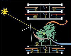 Снижение затрат энергии на отопление здания достигается использованием теплозащитного остекления с коэффициентом теплопередачи приблизительно 1,4–1,6 Вт/(м2.°C). Кроме этого, первый слой играет роль защитной оболочки, уменьшающей конвективный тепловой поток, направленный наружу. Зимой в ночное время пространство между внешней и внутренней оболочками фасада герметизируется, образуя статичную воздушную прослойку, обладающую хорошими теплоизоляционными свойствами. Снижению затрат энергии на отопление способствуют и зимние сады, обеспечивающие дополнительные теплопоступления за счет аккумулирования тепла солнечной радиации. Снижение затрат энергии на охлаждение здания достигается путем использования герметичных двойных стеклопакетов, заполненных инертным газом и отражающих инфракрасное излучение. Такие стеклопакеты используются в зимних садах, а также в ненесущих стенах по периметру офисных помещений. При этом солнцезащитные устройства устанавливаются между стеклопакетом и внешней светопрозрачной оболочкой здания. При поступлении в здание солнечной радиации происходит ее первоначальное ослабление посредством внешней светопрозрачной оболочки. Дальнейшее резкое уменьшение солнечной радиации осуществляется при помощи солнцезащитных устройств. Date: 2015-05-22; view: 606; Нарушение авторских прав |