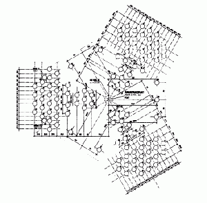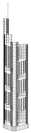 Немецкие строители предложили конструкторское решение, предполагавшее использование железобетона в качестве основного конструкционного материала. Железобетонная конструкция дешевле на несколько миллионов долларов по сравнению со стальной, однако такое решение привело бы к необходимости размещения колонн внутри зимних садов и за счет этого к ухудшению естественной освещенности всего здания. Здание «Commerzbank» стало первым в Германии высотным зданием, в котором сталь использовалась в качестве основного конструкционного материала (рис. 19). Применение стали вместо железобетона в конструкции высотного здания потребовало специальных противопожарных мероприятий, осуществленных немецкой компанией «BPK Brandschutz Planung Klingsch GmbH». В числе прочих мероприятий – применение спринклерной системы, обеспечивающей подачу воды даже при отключении энергии. Конструктивно эта система выполнена в виде емкостей, в которых помимо воды закачен под давлением газ. В случае пожара емкость разгерметизируется и вода под давлением разбрызгивается без дополнительного побуждения. Для ограничения усадки существующего старого 30-этажного здания «Commerzbank», расположенного в нескольких метрах, строители производили забивку свай и заливку монолитного фундаментного основания для каждого угла в отдельности. Забивка свай производилась на 40 м до незатронутой подстилающей коренной породы (здания во Франкфурте обычно имеют фундамент на глубине 30-метрового глинистого пласта). Сплошной фундамент был создан на глубине 7,5 м, его толщина составляет 2,5–4,5 м. 111 свай диаметром 1,5–1,8 м и длиной до 48,5 м собраны по группам под каждой из колонн высотного здания (рис. 20).