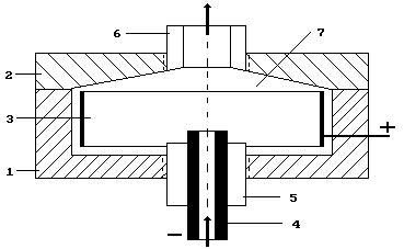 Рис. 1. Схема плазмоэлектролитического реактора № 2: 1-корпус реактора, 2-крышка реактора, 3-анод, 4-катод (впускной патрубок), 5-втулка, 6-выпускной патрубок, 7-межэлектродная камера