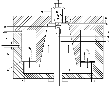 Рис. 2. Схема модели плазмоэлектролитического реактора №3 1 - анод (орта); 2 - катод (молибден); 3 - защита диэлектрического стержня 5 от перегрева; 4 - вольфрамовый стержень; 6 - патрубок для подачи раствора; 7 - патрубок для выхода кислорода; 8 - патрубок для выхода водорода; 9 - патрубок для выхода парогазовой смеси