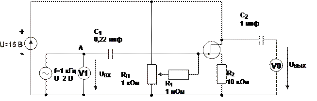 Порядок выполнения эксперимента · Соберите цепь усилителя по схеме с общим истоком (рис. 5.5.1). При этом не перепутайте полярность подключения электролитического конденсатора С3, который служит для исключения отрицательной обратной связи для переменного напряжения.