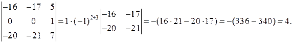 б) Решение. Решение найдем разложением по первому столбцу, но сначала с помощью свойств определителя сделаем нули в этом столбце везде кроме элемента, равного минус единице. Для этого элементы второй строки умножим на два и прибавим к соответствующим элементам первой строки; элементы второй строки прибавим к соответствующим элементам третьей строки; элементы второй строки умножим на два и прибавим к соответствующим элементам четвертой строки. Эти действия записываем так: