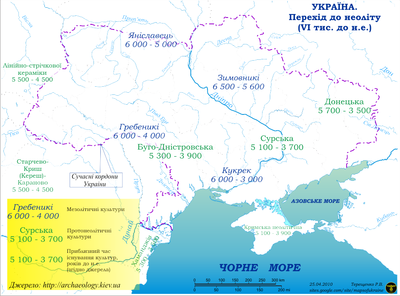 Протягом VІ-ІІІ тисячоліть до н.е. відбувся поворот від збиральництва і примітивного полювання, до відтворюючих видів діяльності, тобто обробітку землі та розведення свійських тварин. Цей процес дістав назву – неолітична революція. Неолітичні культури України: Перехiд вiд присвоюючих форм господарювання до вiдтворюючих тривав протягом багатьох столiть i мав свої особливостi в рiзних регiонах. Фахiвцi видiляють у межах України двi культурно-господарськi зони: пiвденно-захiдну (лiсостепове Правобережжя, Захiдна Волинь, Поднiстров’я, Закарпаття) та пiвнiчно-схiдну (лiсостепове Лiвобережжя, Полiсся). На Півночі та Північному Сході України в неоліті жили племена, які займались переважно мисливством та рибальством, а на Південному Заході віддавали перевагу землеробству та скотарству. Ці племена відрізнялися одне від одного за походженням, побутом, звичками та віруваннями.