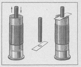 Включив в гнездо Х1 антенну, в гнездо Х2 заземление, а в розетку ХЗ головные телефоны, медленно вращайте ротор подстроечного конденсатора. Его емкость изменяется от минимальной (25 пФ) до максимальной (150 пФ) при поворачивании ротора на половину оборота, то есть на 180°. Но, к сожалению, на корпусе конденсатора нет отметок начальной и конечной емкостей. Поэтому придется повернуть ротор на полный оборот и попытаться поймать хотя бы одну радиостанцию. Поскольку приемник рассчитан на работу в диапазоне средних волн примерно от 600 до 400 м, наиболее вероятная станция, которую можно услышать на большей территории нашей страны, — «Маяк» (547 м). Если не удалось поймать ни одной радиостанции, попробуйте изменить диапазон настройки приемника. Наиболее просто это можно сделать с помощью ферритового стержня диаметром 8 мм и длиной не менее 100 мм от магнитной антенны транзисторных радиоприемников. Медленно вводите его внутрь каркаса катушки (рис. 23). Приемник будет перестраиваться на более длинные волны, и вы наверняка услышите работу местной радиостанции. Опустив стержень внутрь каркаса на возможную длину, плавно настраивайте приемник подстроечным конденсатором в новом диапазоне. Возможно, станция хорошо будет слышна при неполном введении стержня. Тогда сделайте для стержня простейший фиксатор. Вырежьте из толстого картона полоску длиной немногим более диаметра каркаса и прорежьте в центре ее отверстие, в которое стержень должен войти с трением. Наложите полоску на каркас катушки и, придерживая ее рукой, перемещением стержня настройтесь на радиостанцию. Теперь стержень будет удерживаться в нужном положении полоской-фиксатором. Введение стержня внутрь каркаса свидетельствует о том, что для приема хорошо слышимой в вашей местности радиостанции катушка индуктивности должна иметь большее число витков. Задача, конечно, простая, и вы легко справитесь с ней. Отпаяйте нижний вывод катушки от контакта, подсоедините к выводу конец такого же провода и домотайте 165 витков (теперь общее число витков катушки составит 300). Намотку надо производить виток к витку. Когда дойдете до конца каркаса, намотайте провод поверх уже имеющейся обмотки, но в обратном направлении — к верхнему контакту. Конец обмотки подключите к нижнему контакту.