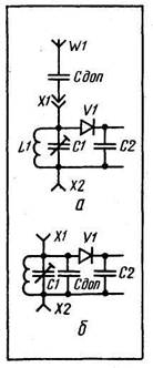 Рис. 24. Способы fea-стройки приемника: а — включением дополнительного конденсатора в цепь антенны; б — включением дополнительного конденсатора параллельно подстроечному Рис. 25. Катушка индуктивности для приемника с повышенной громкостью Рис. 26. Схема включения катушки в приемник