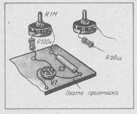 Рис. 43. Внешний вид смонтированной платы и ее соединение с остальными деталями приемника Рис. 44. Цепочка для подбора сопротивления резистора R1