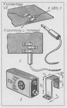 Рис. 48. Самодельные детали для приемника: а — разъем с выключателем питания; б — скоба крепления батареи «Крона»