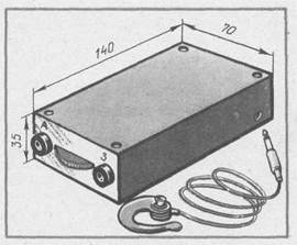 Остается изготовить скобу для крепления батареи «Крона» (рис. 48, б). Материалом для нее может быть любой мягкий металл толщиной 0,5 — 1 мм. Детали приемника (кроме телефона и гнезд) смонтируйте на плате из изоляционного материала (рис. 49). Монтаж здесь более плотный по сравнению с предыдущим приемником. Сделано это для того, чтобы конструкция получилась более компактной, похожей на «карманный» приемник. Соединительные проводники, показанные на чертеже пунктирной линией, проложены снизу платы. В местах, где монтаж наиболее плотный и возможно замыкание, наденьте на выводы деталей хлорвиниловую или резиновую трубочку, а проводники используйте только в изоляции. Провода питания можно подпаивать непосредственно к выводам батареи или использовать для подключения колодку, вынутую из негодной «Кроны». Настала пора проверить приемник и подстроить его, если это понадобится. Но в начале, как всегда, тщательно проверьте правильность монтажа и всех соединений в соответствии со схемой и чертежом монтажной платы. Вставив в ушную раковину миниатюрный телефон, подключите его разъем к приемнику. В телефоне должен сначала раздаться щелчок, а затем появиться слабый шум — признак работы транзисторов. Сразу же проверьте напряжение батареи — оно не должно быть менее 8 В. Затем подключите вольтметр между коллектором и эмиттером транзистора К5 — здесь напряжение должно быть 7 — 8 В (естественно, при хорошей батарее питания). В случае необходимости установите нужное напряжение подбором резистора R6. Следующий этап — проверка напряжения на транзисторах V1 и V2 (также между коллектором и эмиттером). На обоих транзисторах напряжение должно быть в пределах 2 — 4 В. Если вы применили транзисторы с другим коэффициентом передачи тока, то измеренное напряжение отличается от требуемого. Тогда придется подобрать резистор R1 или R3 в зависимости от того, режим какого транзистора нужно изменить. Закончив проверку режимов транзисторов, попытайтесь вращением ручки переменного конденсатора и ориентированием приемника настроиться на близлежащую мощную радиостанцию. Если это не удастся, подключите к гнезду XI комнатную антенну или отрезок провода длиной около 1 м, а к гнезду Х2 — заземление (например, провод, соединенный с батареей отопления или трубой водопровода). Теперь легче будет «поймать» одну из радиостанций средневолнового диапазона. Наибольшей громкости звучания при наименьших искажениях звука можно добиться перемещением каркаса с катушкой связи по ферритовому стержню магнитной антенны. В таком положении каркас следует закрепить на стержне каплей клея или расплавленного парафина. Приведенные для предыдущих конструкций рекомендации по изменению рабочего диапазона приемника пригодны и для этой самоделки. Настроенный приемник вставьте в корпус, внешний вид которого может быть таким, как показано на рис. 50. Часть ручки настройки теперь выходит наружу через отверстие в боковой стенке корпуса. На этой же стенке размещены гнезда подключения антенны и заземления. На другой боковой стенке просверлено отверстие напротив контактов разъема, установленного на плате. При такой конструкции приемника удобнее сделать съемной не нижнюю, а верхнюю крышку корпуса. Конечно, вам предоставляется возможность самостоятельно разработать любой другой корпус и оформить